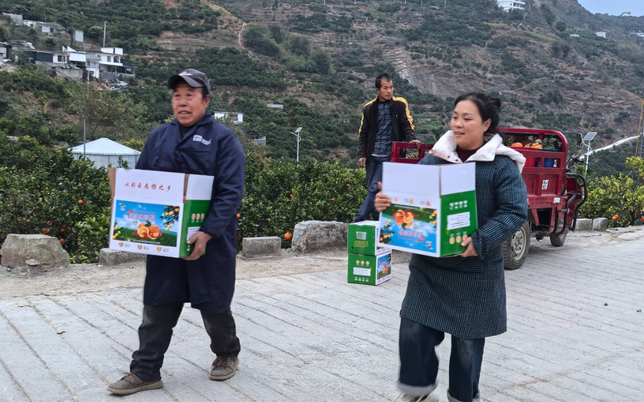 夕阳西下,金沙江畔公路旁,游人提着脐橙装车,喜悦溢于言表。记者来到八角村红元2组,只见别墅掩映在脐橙林中,房前屋后脐橙伸手可及。在村民刘黄静家门口,几名村民正将包装好的“务基脐橙”“溪洛渡脐橙”搬上三轮车,准备快递发往全国。他家种了约10亩脐橙,当天傍晚就请了3名村民采摘了1000多斤鲜果。