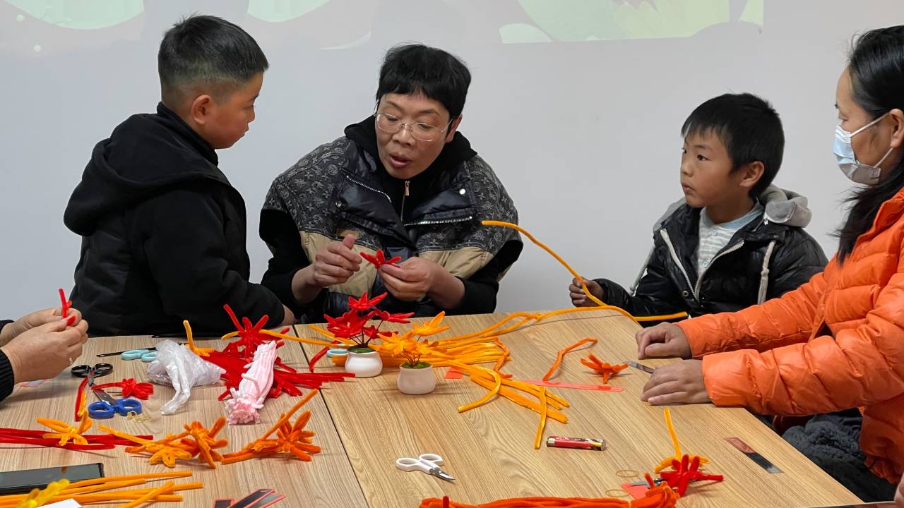 巧手翻飞绽匠心,指尖生花漾温情。 活动现场,罗老师以“新春”为主题,手把手教授扭扭棒花朵的折叠、造型及插花组合技巧。参与者们兴致盎然,用红、橙两色扭扭棒创作出“蜡梅”“福字花束”“小灯笼”等富有节日气息、充满年味的作品,现场欢声笑语不断。直播镜头里,精美的手工作品和热闹的创作氛围,引得线上观众纷纷留言点赞,不少人表示“想学扭扭棒插花”“银龄活动太有意义”。从签到时的满心期待,到教学时的专注提问,再到自由创作时的创意迸发、展示分享时的自豪满满,整场活动洋溢着欢乐与温馨的气息。