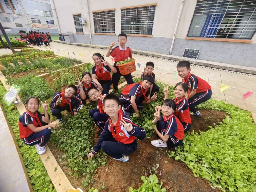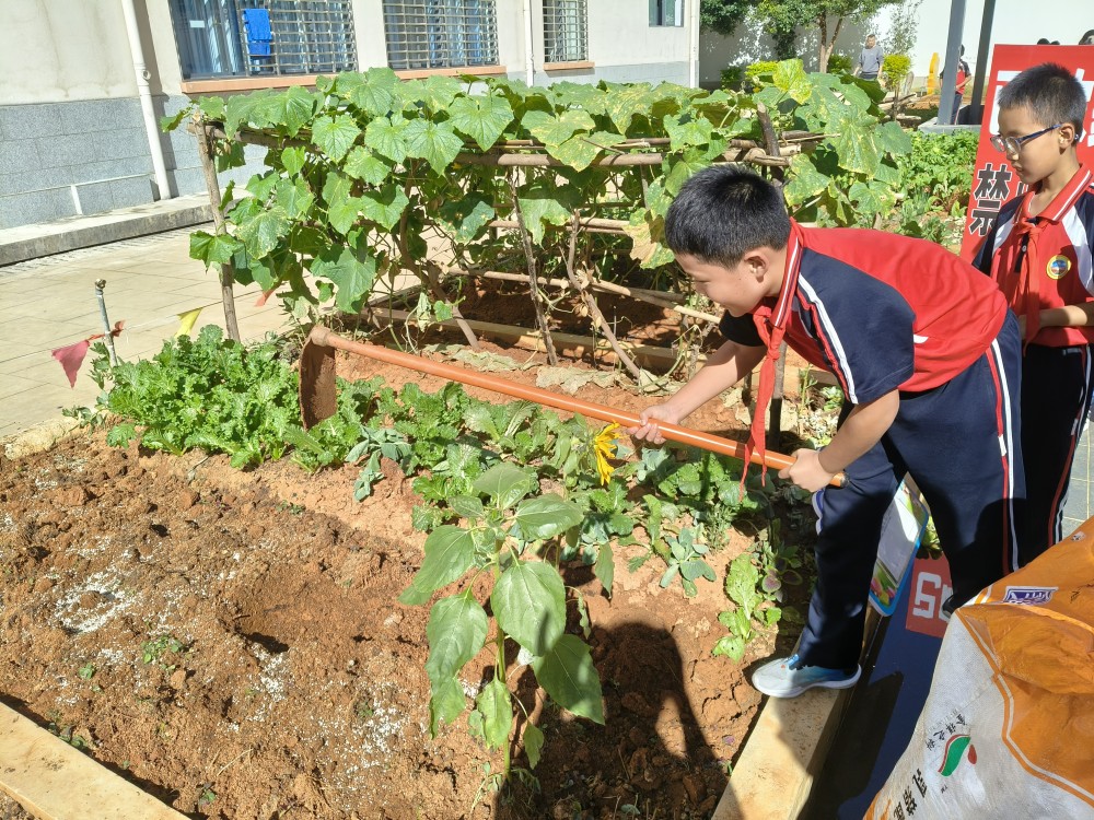 但孩子们的劳动第一课,并不始于灶台。学校在教学楼后方开辟出一块“耕读乐园”,在这片小天地里,青菜、辣椒、西红柿等作物茁壮成长。翻土、播种、浇水、除草,孩子们亲手照料,直到收获。