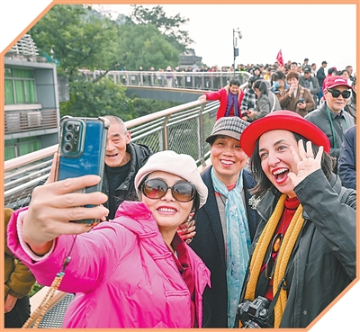 外国游客在重庆半山崖线鹅岭栈桥与市民合影。新华社记者陈诚摄