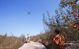 11月26日,一架无人机穿梭在昭阳区洒渔镇白鹤村山间的苹果林中,这是当地苹果种植户郑修成在用无人机吊运苹果。