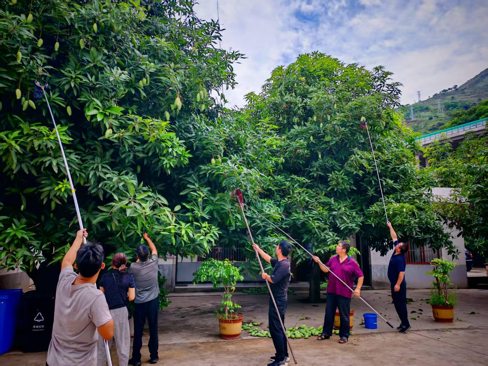 在蒙姑社区,每到芒果成熟时节,家家户户都忙着采摘。身手矫健的村民爬上果树,背靠枝干,一手提桶一手采摘,转眼便收获满满。而那些不擅长爬树的村民则在树下用特制的长杆网兜采摘,同样收获颇丰。